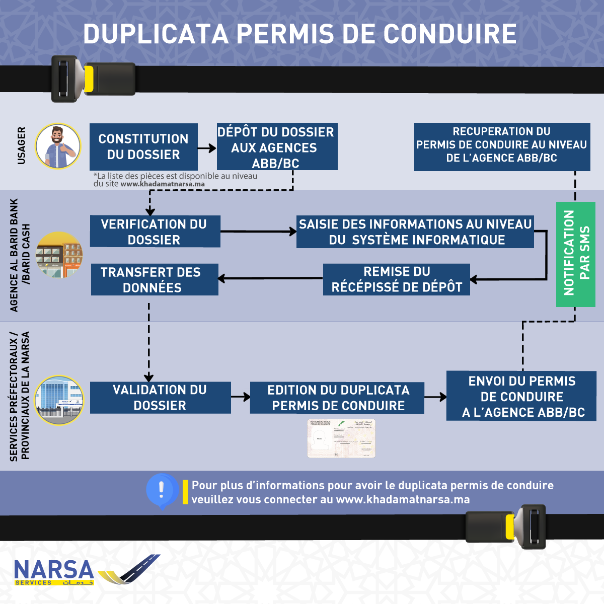 Ces agences se chargeront de la réception des dossiers et leurs traitement au niveau du système mis à leurs dispositions par la NARSA . Les services territoriaux de la NARSA (centres d’immatriculation) procèdent à la validation des dossiers et par suite les citoyens récupèrent les nouveaux supports dupliacta au niveau des agences de dépôt.