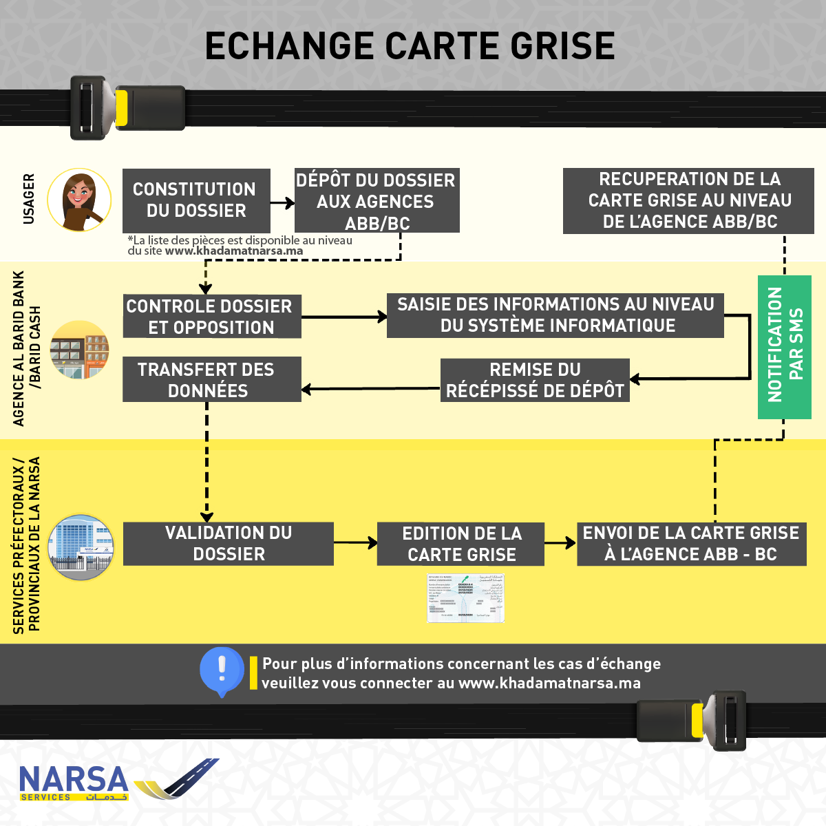 Pour procéder à l’échange du certificat d’immatriculation (carte grise) d’un véhicule immatriculé au Maroc dans la série normale, le propriétaire doit déposer, contre récépissé valable 60 jours, un dossier d’échange du certificat d’immatriculation auprès des agences AL Barid Bank/Barid Cash du lieu de sa résidence.